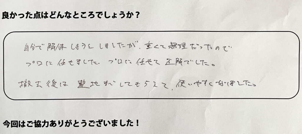 自分で解体しようとしましたが、重くて無理だったのでプロに任せて正解でした。撤去後は整地までしてもらえて使いやすくなりました。