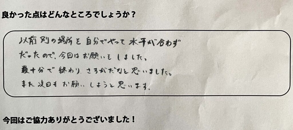 以前別の場所を自分でやって水平が合わずだったので、今回はお願いをしました。数十分で終わり流石だなと思いました。また次回もお願いしようと思います。