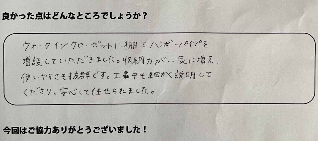 ウォークインクローゼットに棚とハンガーパイプを増設していただきました。収納力が一気に増え、使いやすさも抜群です。工事中も細かく説明してくださり、安心して任せられました。