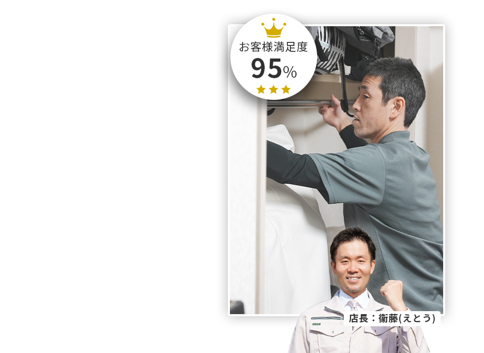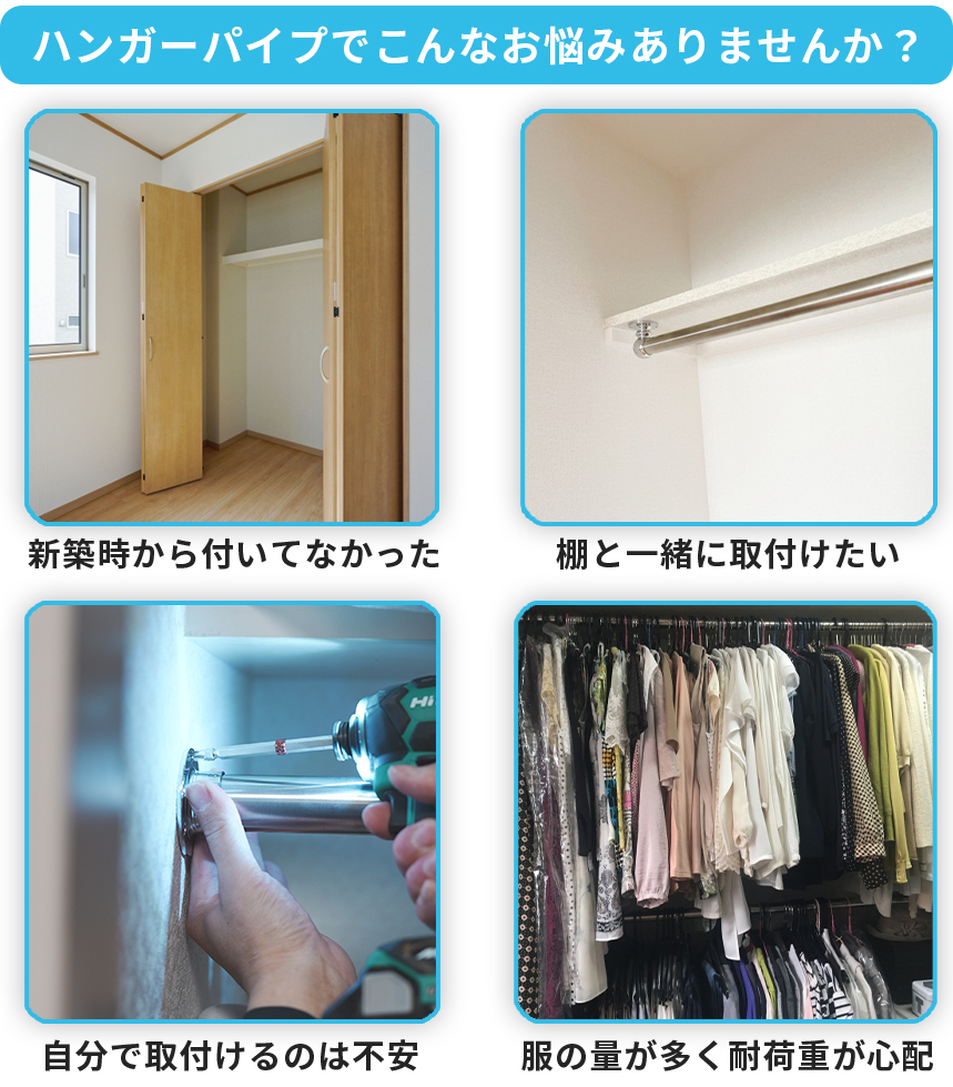 メッセージ:ハンガーパイプは適切な位置にしっかり取り付ければ、収納力が増し、使い勝手も大きく向上します。ところが自分で取り付けようとすると、水平がずれたり壁に固定できなかったりと、思っていた以上に難しい作業というのが分かります。場合によっては衣類の落下や壁の破損につながることもあります。