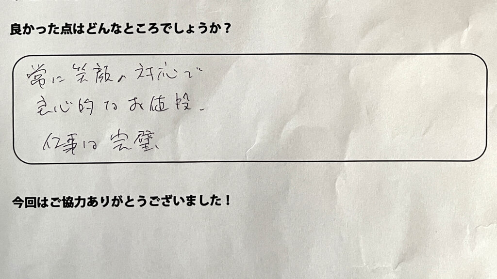素早い対応でした。作業後の説明も納得できました。作業内容と価格のバランスが良いと思います。