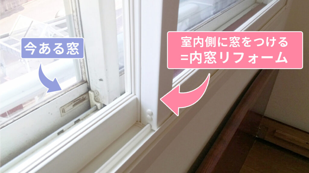 内窓リフォームは既存の窓と新たに室内側に窓を取り付けることでその間に空気層を作ります。ダウンジャケットと同じ原理で空気層があると熱の移動を抑えることが出来ます。また、室内側につける窓のサッシを樹脂にすることで熱を通しにくくしています。